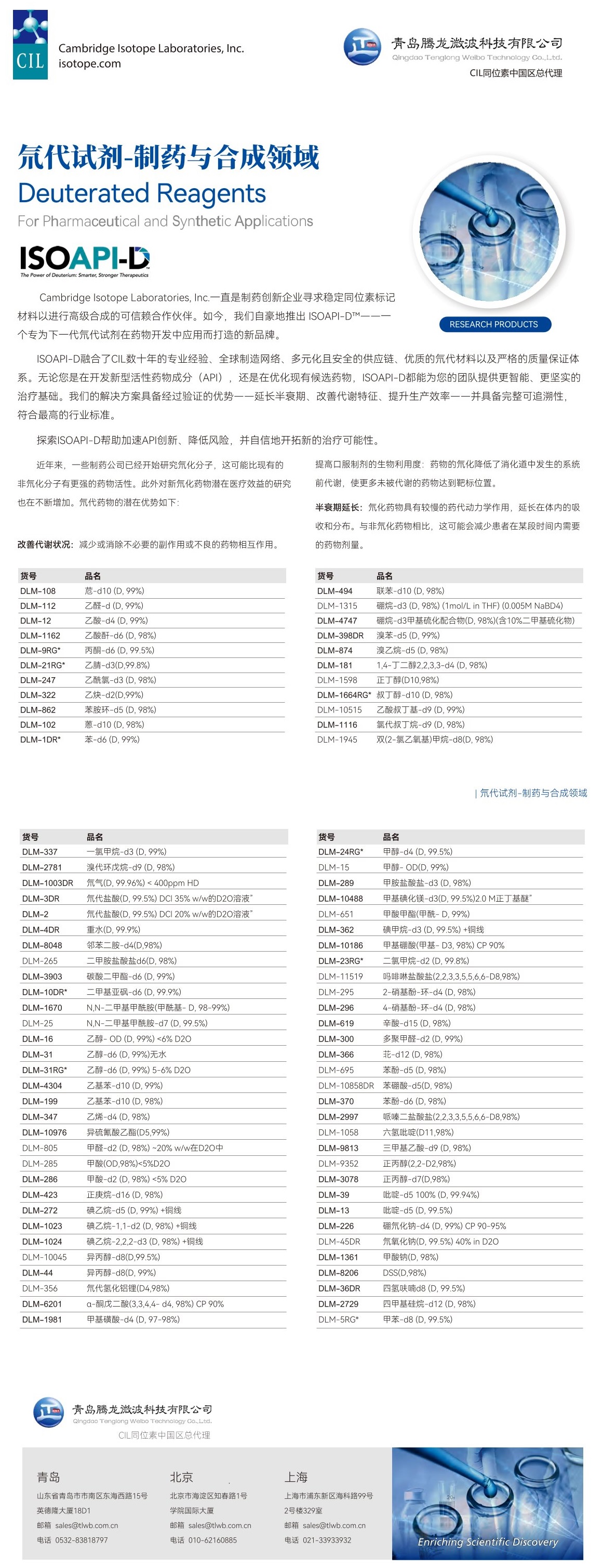 “ISOAPI-D 代表了我们持续致力于支持制药创新这一使命的下一步举措,”CIL公司氘化试剂应用业务将持续扩大的生产能力、严格的质量标准以及数十年的经验使CIL产品能够满足行业不断变化需求。